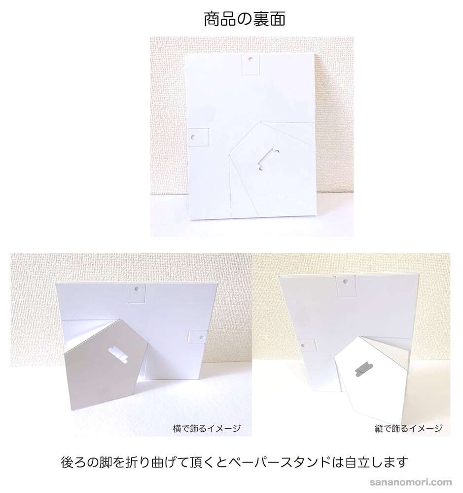裏面にスタンド・フック穴があり、置いたり壁に掛けたりして飾れます。